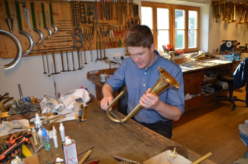 Sebastian Schwaiger hatte sein Talent sozusagen „im Blut“, da sein Großonkel der Blechblasinstrumentenbauer Axel Müller, ihn schon früh dafür begeistern konnte. Der Opa spielte Tuba, der Vater Flügelhorn, im Blasorchester im Ort. Und so besuchte der musikalisch Vorbelastete die Berufsschule für Instrumentenbau in Mittenwald, auch als Geigenbau-Metropole bekannt. Danach absolvierte er seine Meisterprüfung und wagte 2010 den Sprung in die Selbstständigkeit.