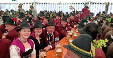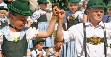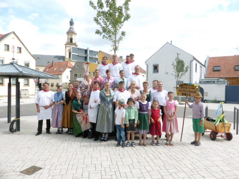 Die Bergrheinfelder Plüapaare und die Rheinfelder Musikanten grüßen aus Franken die Leserschaft der Samerberger Nachrichten – mit einem Bild von den Tänzerinnen und Tänzern an der Kerm 2016 in der Dorfmitte von Bergrheinfeld.