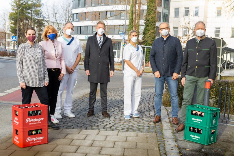 Bild: RoMed Kliniken – Die RoMed Kolleginnen und Kollegen freuen sich über die vielen Getränke – v.l.n.r.: Jenny Kercher, Pflegedienstleiterin, Marisa Steegmüller, Geschäftsführende Gesellschafterin Flötzinger Brauerei, Marc Oliver Otto, Bereichsleiter, Dr. Jens Deerberg-Wittram, Geschäftsführer RoMed Kliniken, Carolin Groß, Gesundheits- und Krankenpflegerin, Dirk Steinebach und Thomas Frank, Geschäftsführer Auerbräu