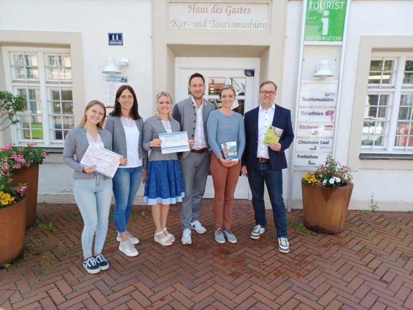 Bericht: BRB – Foto: Markt Prien a. Chiemsee: Leonie Muschalla, Andrea Stephan und Stefanie Sattlberger (Mitarbeiterinnen Tourismusbüro), Florian Tatzel (Leitung Tourismusbüro), Martina Binsteiner-Witzl (Stellvertretende Leiterin Tarif und Teamleiterin Kundencenter BRB), Tobi Huber (Fachbereichsleiter Kultur, Tourismus & Wirtschaftsförderung Markt Prien a. Chiemsee), von links nach rechts.