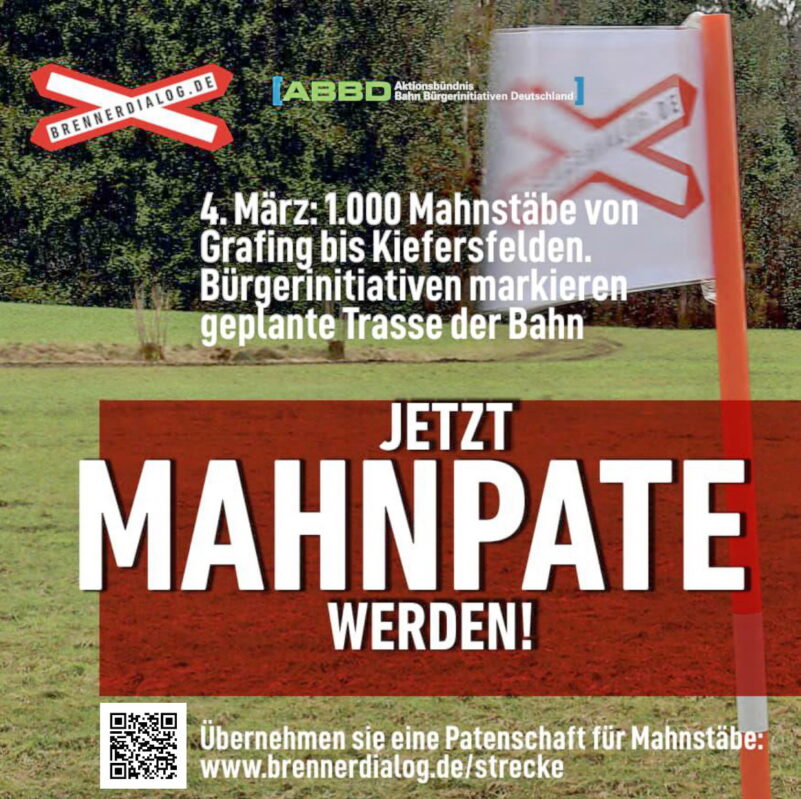 Um erneut ein Zeichen zu setzen und deutlich zu machen, welche verheerenden Auswirkungen der Neubau einer Hochgeschwindigkeitsstrecke ohne Bedarfsnachweis für die Region hat, soll am Samstag , 04. März der geplante Streckenverlauf des Brennernordzulaufs im Landkreis Rosenheim mit Mahnstäben und Fackeln markiert werden. An drei zentralen Orten der geplanten Strecke, darunter Lauterbach in der Gemeinde Rohrdorf, werden Informationsveranstaltungen stattfinden. Durch die Teilnahme an der Veranstaltung und/oder  durch die Übernahme einer Patenschaft für einen der Mahnstäbe kann jeder einzelne friedlich seine Meinung zu diesem Projekt zum Ausdruck bringen. Die Mahnstäbe werden auf Wunsch mit einem Spruch und dem Namen des Paten versehen. Durch Scannen des QR Codes mit der Handykamera oder Aufrufen der Website www.brennerdialog.de/strecke/ gelangt man zur Anmeldung.