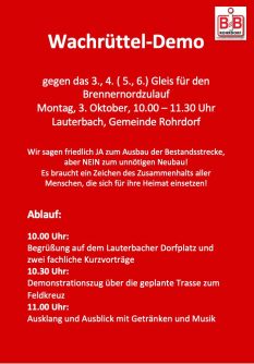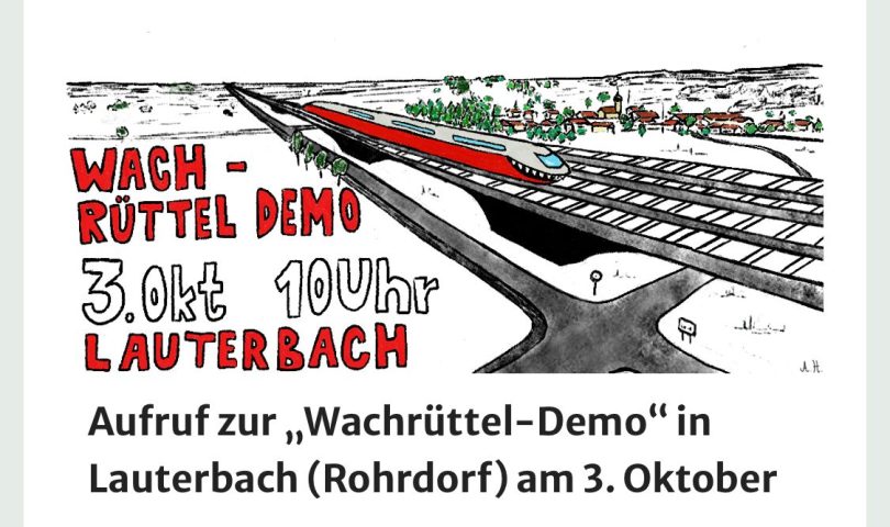 Zu einer “Wachrüttel-Demo” gegen die Neubau-Pläne für den Brennernordzulauf wird am Tag der Deutschen Einheit, 3. Oktober, in Lauterbach in der Gemeinde Rohrdorf aufgerufen. Die Demonsration geht von 10 bis 11.30 Uhr und hat folgenden Ablauf: