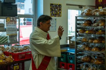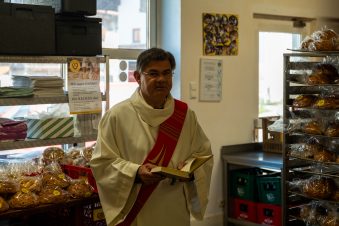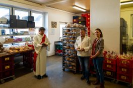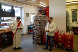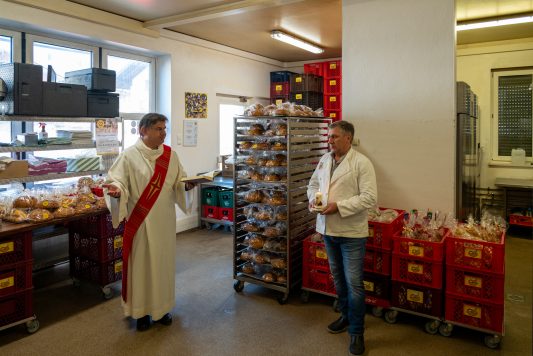 Fotos: Rainer Nitzsche – Diakon Günter Schmitzberger und Wolfgang Sattelberger bei der Segnung in der Backstube von Rohrdorf