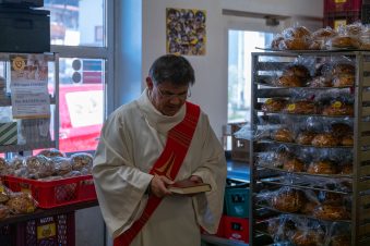 Nachdem derzeit die Menschen nicht zu gemeinsamen Gottesdiensten und auch nicht zur traditionellen Segnung österlicher Köstlichkeiten in die Kirche kommen können, hat sich Diakon Günter Schmitzberger vom Pfarrverband Rohrdorf-Samerberg auf den Weg in die Rohrdorfer Backstube vom Dorfbäcker Wolfgang Sattelberger gemacht. Dort segnete er (ohne Weihwasser) Brote, Osterfladen und Osterlämmer, die es am Karsamstag in den Dorfbäcker-Läden in Rohrdorf, Grainbach und Prutting gibt. Diese Filialen haben am Samstag von 6 Uhr bis 13 Uhr geöffnet, an den Osterfeiertagen bleiben sie geschlossen.