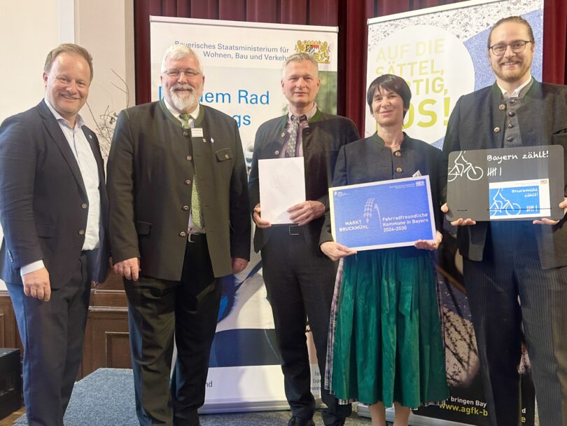 Jetzt war es soweit: Im Rahmen eines Festakts in München erhielten acht Kommunen, darunter Bruckmühl, die Auszeichnung „Fahrradfreundliche Kommune in Bayern“. Staatsminister Christian Bernreiter übermittelte seine Grußworte in einer Videobotschaft. Zu der gemeinsamen Veranstaltung der AGFK Bayern und des Bayerischen Staatsministeriums für Wohnen, Bau und Verkehr in der Scholastika, im Herzen Münchens, konnte Moderator Roman Roell rund 80 Gäste aus Politik, Wirtschaft, Verwaltung und Verbänden begrüßen. Der bayerische Verkehrsminister Christian Bernreiter übermittelte in einer Videobotschaft seine Grußworte: „Die Gemeinschaft der Kommunen, die sich für den Radverkehr einsetzen, wird immer stärker.