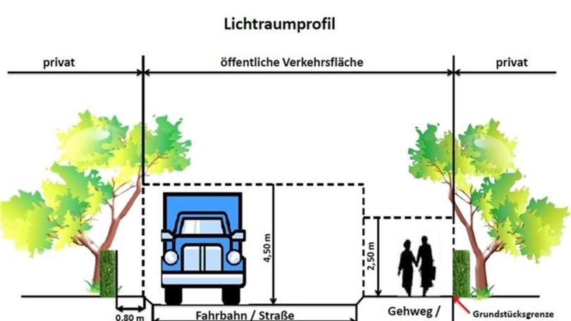 „ Zu hoch gewachsene Hecken und wuchernde Sträucher sind ein Ärgernis für Fußgänger. Und können durchaus eine Gefahr für Leib und Leben bedeuten, wenn sie den Straßenverkehr behindern“, so Söhnel. Auch der Bauhof hat die Situation nun vermehrt im Blick und meldet Problemfälle. Dabei sind die einzuhaltenden Regeln in diesen Fällen ganz einfach: Über dem Gehweg muss ein Freiraum von 2,5 Meter und über der Fahrbahn ein Freiraum von 4,5 Meter gemessen von der Straßenkante frei sein. „Insbesondere ist der Abstand von einem halben Meter zum Straßenrand einzuhalten“, betont Söhnel. Zudem weist auch die Polizei daraufhin, dass Verkehrszeichen nicht verdeckt werden dürfen. Die Pflanzen seien so zurückzuschneiden, dass diese von den Verkehrsteilnehmern rechtzeitig wahrgenommen werden können. Straßenlaternen sind manchmal durch Äste und Blätter derart eingewachsen, dass deren Leuchtwirkung beeinträchtigt wird. Auch hier gilt es, die Äste so zurückzuschneiden, dass die Leuchten nicht in ihrer Funktion eingeschränkt werden. Wenn die oben genannten Abstände nicht mehr eingehalten werden, sind alle Eigentümer aufgefordert, dringend den Rückschnitt der überhängenden Äste und Zweige vorzunehmen – anderenfalls drohen Schadenersatzansprüche.