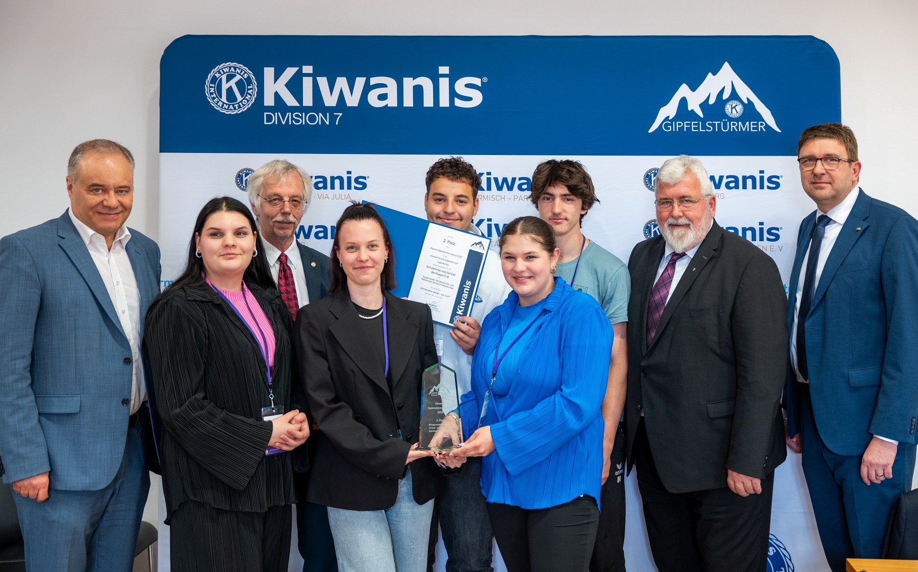 2. Platz des Kiwanis Gipfelstürmer Awards 2024 Bürgermeister-Schütte-Grund- und Mittelschule in Garmisch-Partenkirchen mit dem Projekt „Schnell daher gesagt – was nun?“. Personen auf dem Foto von links nach rechts Harald Kühn, MdL (CSU), Giulia Ungureanu (Preisträgerin), Peter Bitzl (Kiwanis), Dorka Kanya, Lorjan Blakaj, Vanessa Bischof, Leonhard Paglia (alle Preisträger), Sebastian Friesinger MdL (CSU), Thomas Quiram (Kiwanis)