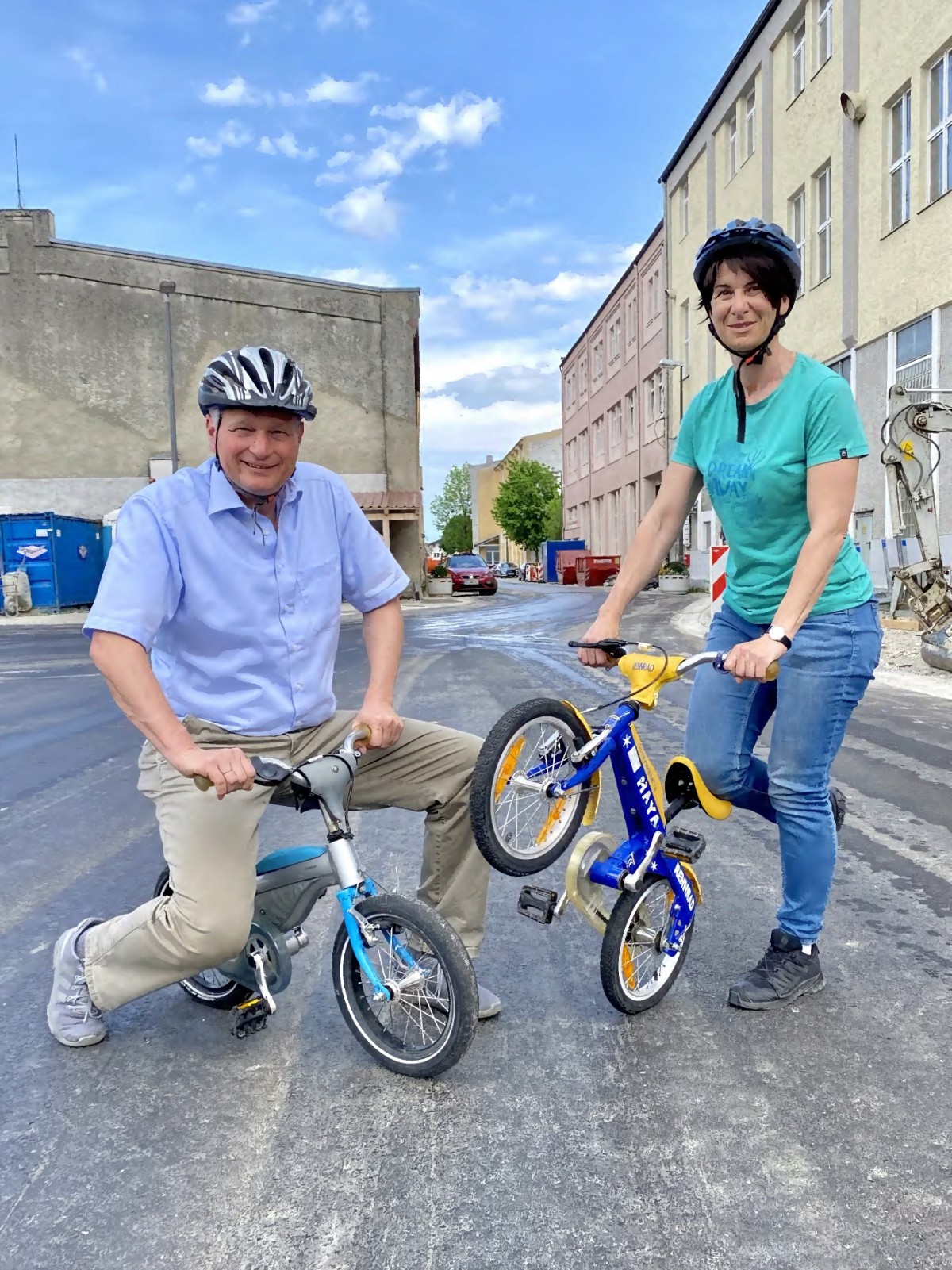 Bruckmühls Bürgermeister Richard Richter (links) und Stadtradel-Organisatorin Anna Heimgartner (rechts) freuen sich schon auf die Touren, zahlreiche eingefahrene Kilometer und wollen zugleich das Bewusstein für den gesunden Radsport stärken . Die Beiden gehen mit gutem Beispiel voran und treten selbst fleißg in die Pedale. Aber dann mit ihren richtigen großen Fahrrädern. Foto Neuwirth