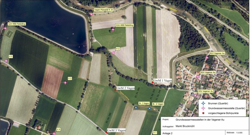 Eine sichere Trinkwasserversorgung und Schutz vor Hochwasser haben – hat nicht erst angesichts der jüngsten Unwetterkatastrophe – höchste Priorität. Das Hochwasserrückhaltebecken in Feldolling soll hier künftig einen großen Beitrag gegen Überschwemmungen leisten. Doch bis dahin musste -wie berichtet – ein neuer Trinkwasserbrunnen in Götting errichtet werden, um die Trinkwasserversorgung Bruckmühls sicherzustellen. Zudem muss, da das Wasserrecht an den Brunnen Vagen I und II ausgelaufen ist, jetzt ein neues Trinkwasserschutzgebiet im Bereich der beiden Bruckmühler Brunnen Vagen I und II nahe dem Rückhaltebecken ausgewiesen werden. Die ersten Schritte laufen aktuell dafür.