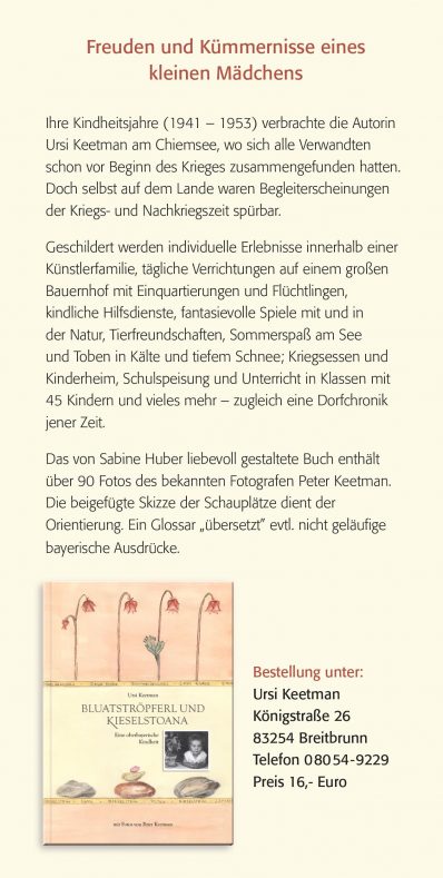 Die Breitbrunnerin Ursi Keetman hat ein wunderschönes Buch geschrieben über ihre Kinderzeit in Breitbrunn. Die Familie kam hierher. Der Fotograf Peter Keetman von dem grad eine Ausstellung in Essen und in München war lebte hier und auch ihre Tante die mehr Teile am Orffschen Schulwerk geschrieben wie der Orff selbst.