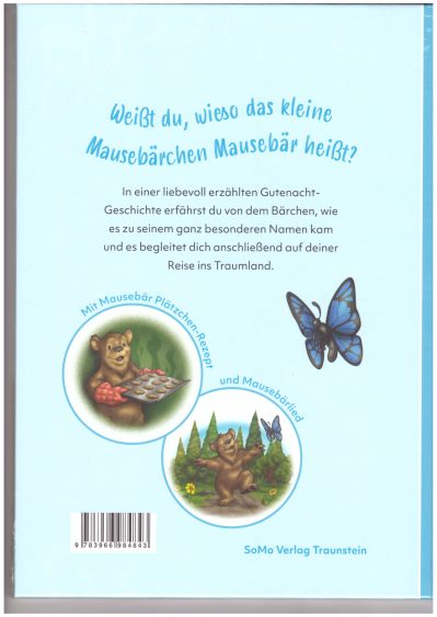 Mausebärchen. Mausebär hat keine Mauseohren und auch keinen Mauseschwanz. Eigentlich ist es ein ganz normales kleines Bärchen, aber trotzdem ist es etwas ganz Besonderes, so wie jedes Kind etwas Besonderes ist. In einer Einschlafmeditation begleitet ein goldener Stern das Kind ins Traumland. Zudem gibt es in dem wunderschön illustrierten Bilderbuch die Noten und den Text zum Lied „Hallo, ich bin der kleine Mausebär“ und ein Rezept für vollwertige Kekse „Mausebärs Bärenpfötchen“.