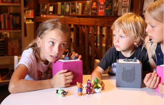 Die Toniebox ist die neue Version des CD-Spielers und in vielen Haushalten mit Kindern nicht mehr weg zu denken. Drei dieser Boxen und über 100 Tonies – kleine, magnetische Hartgummi-Figuren – hält die Bücherei Prien ab sofort zur Ausleihe bereit. Diese Figuren decken zahlreiche Themen ab, von Wissensthemen aus der Reihe „Was ist was“ über Kinderlieder bis hin zu Hörspielklassikern wie Bibi Blocksberg und die Olchis. Die Toniebox ist kinderleicht zur bedienen und richtet sich an Drei- bis Achtjährige: Um den Hörgenuss zu starten kneift man in das „Ohr“ der Box, stellt einen gewünschten Tonie auf das grün leuchtende Feld und schon beginnt die Wiedergabe der zur Figur passenden Geschichte. Zum vor- und zurückspulen klopft man links und rechts gegen den Würfel und zum Beenden nimmt man einfach den Tonie herunter. Ein weiterer Vorteil des praktischen Audiosystems besteht in seiner Qualität und Langlebigkeit. Die Box ist aus nachhaltigen Stoffen genäht und die unterschiedlichen Figuren aus den bekannten Kinderbuchreihen sind allesamt handbemalt. „Die Hörbücher auf CDs sind sehr empfindlich und zerkratzen gerade im Kinderzimmer schnell – die Tonies sind eine robuste Alternative, wie für die Bücherei gemacht,“ freut sich die Büchereileiterin Bernadette Binder. Unter den Neuanschaffungen für die Kinderabteilung sind noch drei digitale Bookii-Stifte und 18 Bücher, deren Inhalte mit dem digitalen Hör- und Aufnahmestift zum Leben erweckt werden. Die Erweiterung des Sortiments verdankt die Bücherei Prien einer Förderung der Landesfachstelle für das öffentliche Bibliothekswesen in Bayern und einer Kooperation mit dem örtlichen Kinderladen Prienatura. Dort kann man künftig eine eigene Toniebox und seine Lieblingstoniefiguren erwerben.