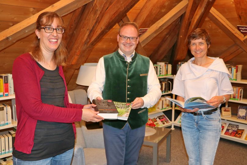 Foto: Prien Marketing GmbH – Büchereileiterin Christina Klasna (links im Bild) und die Geschäftsführerin der Prien Marketing GmbH Andrea Hübner (rechts im Bild) nehmen die ersten drei Bücher in Empfang, deren Patenschaft der Erste Bürgermeister der Marktgemeinde, Andreas Friedrich, übernommen hat.