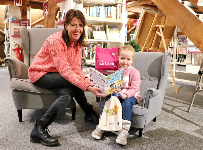 Foto: Prien Marketing GmbH – Lesespaß von Anfang an – die junge Büchereibesucherin Eva Beck liest gemeinsam mit der Büchereimitarbeiterin Bianca Radlinger in ihrem neuen Buch „Unsere Tiere und ihre Kinder“.