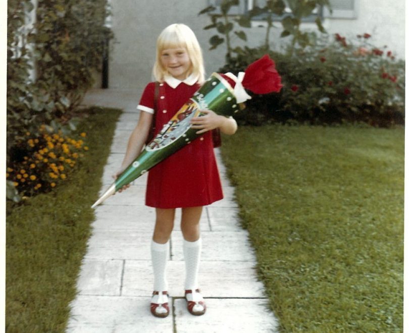 Foto: Prien Marketing GmbH – auf dem Foto ist die Büchereimitarbeiterin Moni Zech an ihrem ersten Schultag im Jahr 1970 zu sehen. Gemeinsam mit ihren Kolleginnen ist sie auf dem druckfrisch erschienen Flyer zur Fotoaktion „Schulanfang im Wandel der Zeit“ abgebildet.