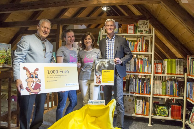 Die Bücherei Prien ist eine von 50 Bibliotheken in Bayern, die der größte regionale Energienetzbetreiber unter dem Motto „Alltag aus. Lesen an.“ mit dem „Lesezeichen 2017“-Preis in Höhe von 1.000 Euro ausgezeichnet hat. Am Freitag, 28. Juli 2017 überreichte Alexander Usselmann, Kommunalbetreuer der Bayernwerk AG, im Beisein des zweiten Bürgermeisters Hans-Jürgen Schuster und der Geschäftsführerin der Prien Marketing GmbH Andrea Hübner, eine Urkunde für die geleistete Bibliotheksarbeit und einen Mediengutschein an Büchereileiterin Bernadette Binder, stellvertretend für das gesamte Büchereiteam. Schwerpunkte der Bücherei Prien sind es mittels kindgerechter Medien und einem bunten Rahmenprogramm Lese-, Sprach-, Informations- und Medienkompetenz zu vermitteln. „Um Mädchen und Buben von klein auf für Bücher zu begeistern, bedarf es guter Ideen. Beispielsweise werden die Kleinen bei unserem dreimal monatlich stattfindenden Bilderbuchkino spielerisch an den Umgang mit Büchern, das Zuhören und Verstehen von Geschichten oder an die im jeweiligen Buch behandelte Thematik herangeführt“, so Bernadette Binder. Die finanzielle Unterstützung der Bayerwerk AG wird zweckgebunden für den Bestandsaufbau im Kinderbereich eingesetzt. „tiptoi® – ein orangefarbener Stift, der Spiele, Puzzles und Bücher hörbar lebendig macht – ist bei Kinder sehr beliebt“, weiß der zweite Bürgermeister aus eigener Erfahrung mit seinen Enkelkindern zu berichten. Mit dem gespendeten Betrag wird das vorhandene audiodigitale Sortiment von Ravensburger um zusätzliche Produkte erweitert.