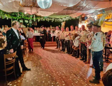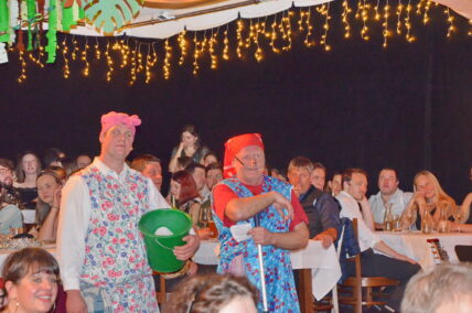 Gegen Mitternacht marschierte die Vogtareuther Faschingsgilde mit Ihrem Prinzenpaar Verena I. und Dominik I. ein. Hofmarschall Peter Rottmooser bedankte sich bei der Gemeinde, da einige Söchtenauer bei ihrer Gilde mittanzen und im Elferrat sind. Nach Ihrem wunderbaren Prinzenwalzer durfte das Prinzenpaar im Auftrag des Vereins ein paar Faschingsorden für verdiente Mitglieder verleihen. Thomas Schöberl, Anton Grießer sen., Wolfgang Seidl sen. Und Norbert Zehrer wurden für ihre steten Arbeitseinsätze im Laufe der Jahre belohnt. Außerdem wurde Vorstand Joachim Pfaller ohne sein Wissen für seine Vereinsführung und die Bewältigung der Herausforderung der vielen Kartenanfragen mit einem Orden gewürdigt. Für die ausgelassene Stimmung zeichnete sich auch mitunter die Band „Huraxdax“ verantwortlich. Inspiriert von der tollen Stimmung spielten freiwillig wesentlich länger als vereinbart, so dass auf eine Barbeschallung vollends verzichtet werden konnte.