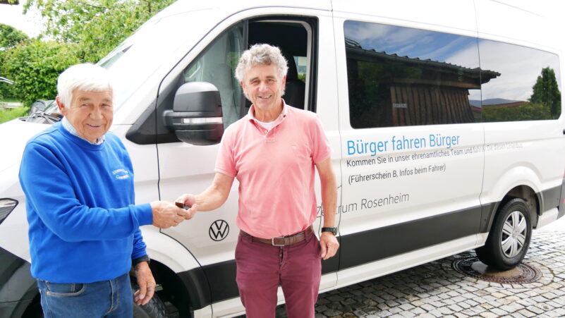 – Schichtwechsel mittags in Amerang: Hans Zagler (rechts) übergibt den Bürgerbus-Schlüssel an Theo Mayerhöfer, der den Neunsitzer schon über 200-mal unfallfrei durch den Chiemgau gesteuert hat.