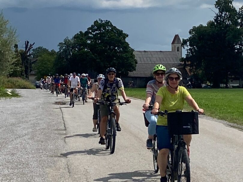 Ein imposantes Bild bot dann der lange Tross der Radler, die angeführt von Bruckmühls Radverkehrsbeauftragtem Andreas Wieser und Bürgermeister Richter gen Höglinger Weiher fuhren. Die Schlusslichter waren in ihren gelben Warnwesten unverkennbar Lisa Brossmann und Jennifer Steinberger (beide Ordnungsamt Bruckmühl). Die Beiden sorgten dafür, dass keiner der Teilnehmer auf der Strecke verloren ging. Als Hilfe bei technischen Schäden, kleinen Verletzungen oder Versorgungssachen begleitete Silvia Mischi (Stadtmarketing) die Tour als „Besenwagen“ mit einem Bauhof-Pritschenwagen.