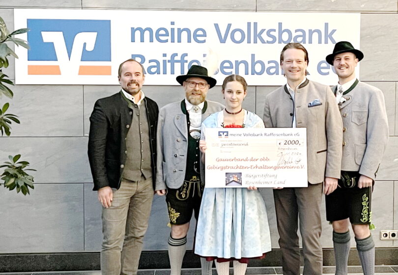 Der Trachtennachwuchs und die Jugendarbeit ist ein wichtiger Bestandteil, um die alten Traditionen und das Brauchtum der Trachtensache auch an die nächsten Generationen weiterzugeben. Hans März, Gebietsvertreter im Gauverband 1, ist in der Jugendförderung vereinsübergreifend für das Gebiet Simssee zuständig und sehr engagiert. Das Gebiet Simssee umfasst 14 Vereine von Samerberg, über die Vereine Rund um den Simssee bis Wasserburg. Der Bürgerstiftung Rosenheimer Land liegt die Jugendarbeit in den Vereinen sehr am Herzen und trägt somit zur Förderung im Jugendbereich des Gebiet Simssee mit einer Spende in Höhe von 2000€ bei. Johann Hell (Abteilungsleiter Stiftungs- und Generationen-Management der meine Volksbank Raiffeisenbank eG) und Peter Mitterer (Hauptgeschäftsstellenleiter in Prutting der meine Volksbank Raiffeisenbank eG) überreichten den Scheck an Hans März (Gebietsvertreter Gebiet Simssee/Gauverband 1), Bernadette Mittermeier & Kilian Dobner (GTEV Wasserburg).