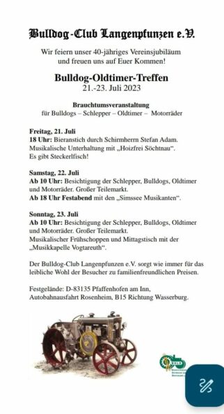 Anlässlich ihres 40-jährigen Vereinsjubiläums lädt der Bulldog-Club Langenpfunzen bei Rosenheim am kommenden Wochenende, 21. bis 23. Juli, zum Bulldog-Oldtimer-Treffen ein. Die Feierlichkeiten finden im Festgelände von Pfaffenhofen am Inn statt.