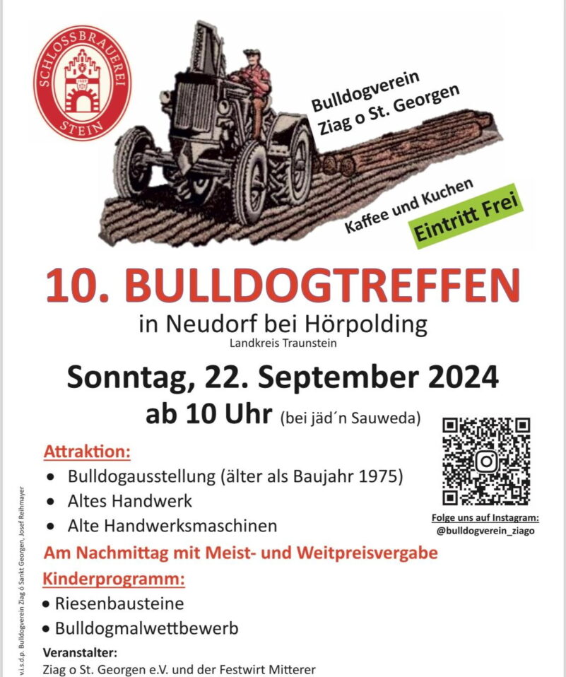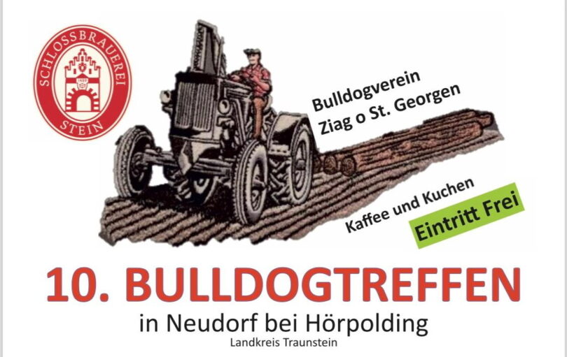 Zum 10. Bulldogtreffen lädt der Verein Ziag o St. Georgen nach Neudorf bei Hörpolding (Landkreis Traunstein) ein.