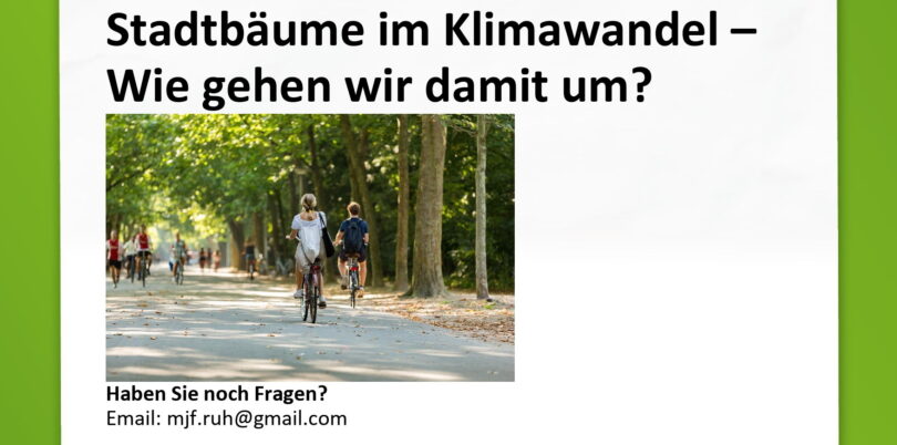 Insbesondere der öffentliche Vortrag ab 19 Uhr zum Thema Stadtbäume im Klimawandel ist von öffentlichem Interesse. Neben den Wirkungen von Bäumen für das Kleinklima im bebauten Bereich sind z.B. auch praktische Fragestellungen relevant, z.B. welche Baumarten sich im Hinblick auf den Klimawandel noch eignen.