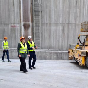 Rohrdorfer Geschäftsführer Mike Edelmann (rechts) erläutert Frau Geywitz die Herausforderungen der CO₂-neutralen Produktion.
