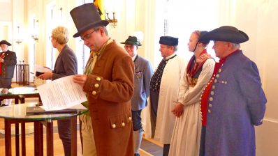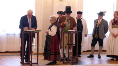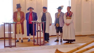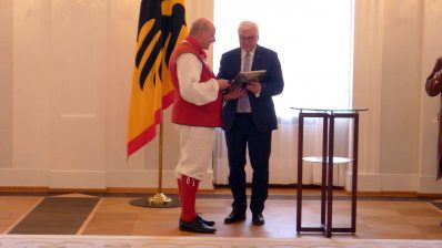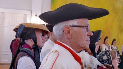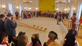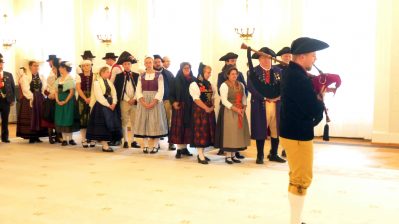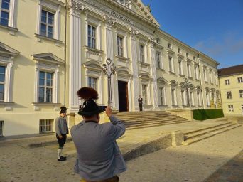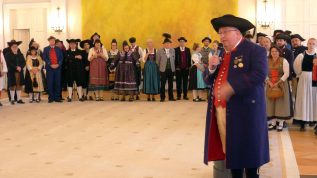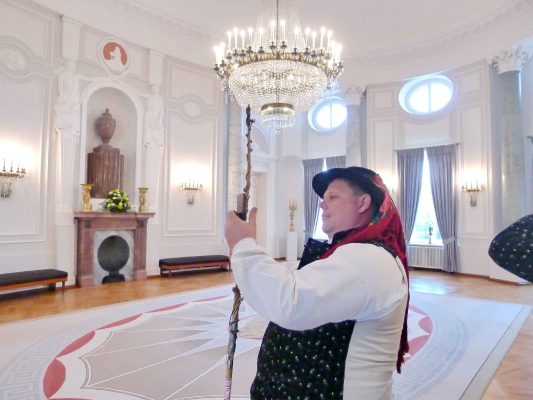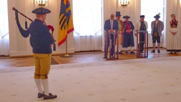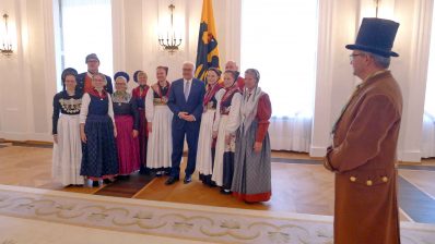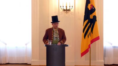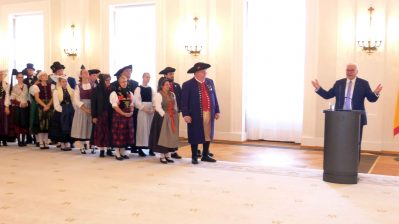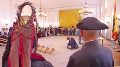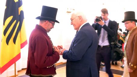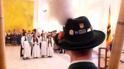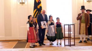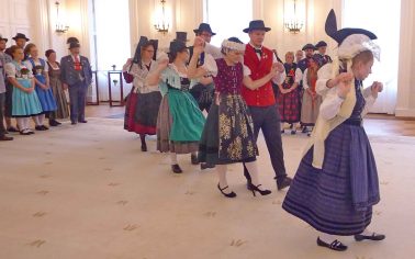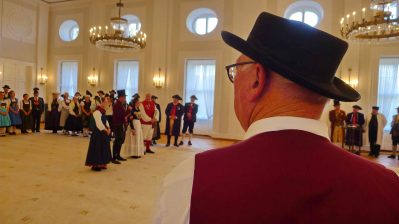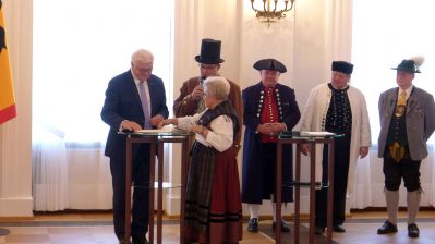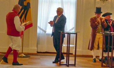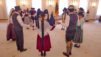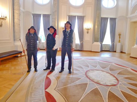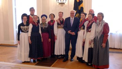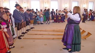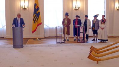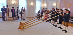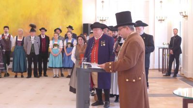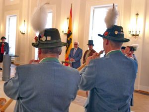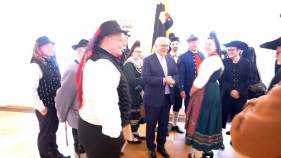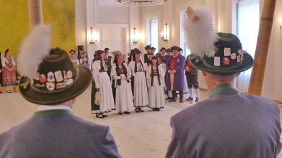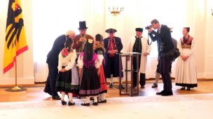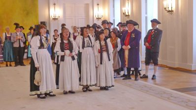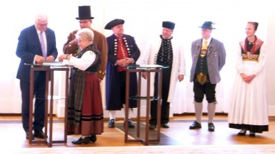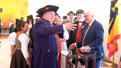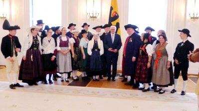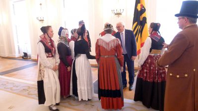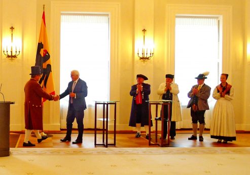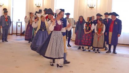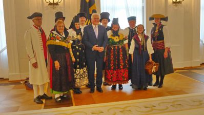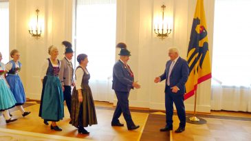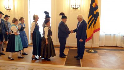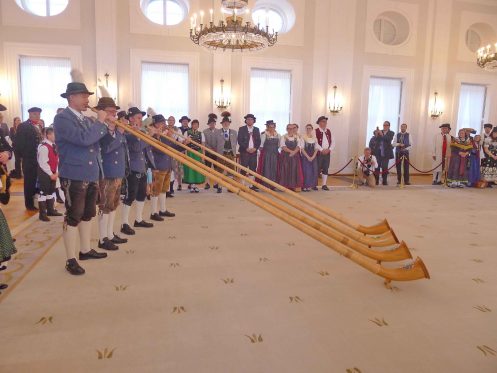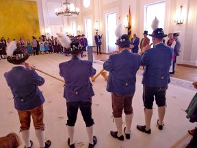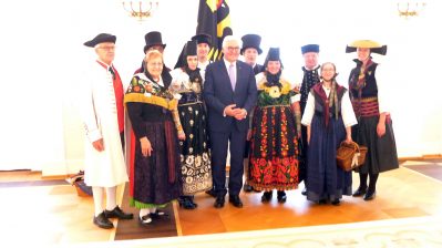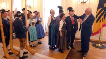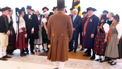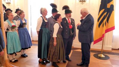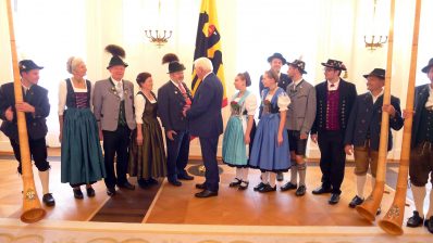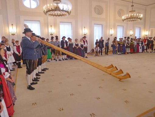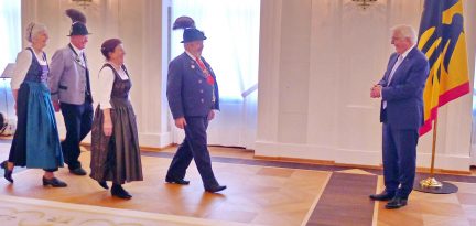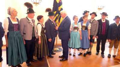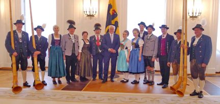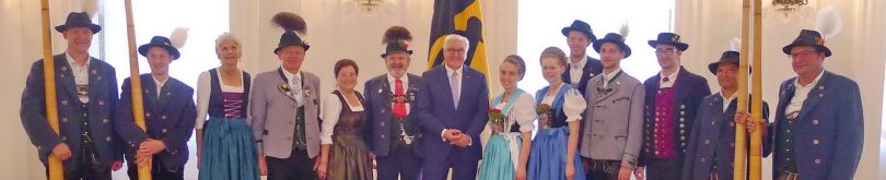 „90 Jahre Deutscher Trachtenverband“ waren Anlass für Bundespräsident Frank-Walter Steinmeier, 120 Trägerinnen und Träger unterschiedlichster Trachten aus allen Landesteilen der Bundesrepublik zu einem Empfang im Großen Saal von Schloss Bellevue einzuladen. Bei seiner Begrüßung sagte er: „Die Vielfalt der Trachten sind ein Schaufenster der deutschen Kultur und Landsmannschaften, außerdem tragen die Trachten zum Selbstbewusstsein und zur Gemeinschaft bei, ich danke für Euer Ehrenamt und freue mich auf einen beschwingten nachmittag“. Das anschließende Programm erläuterte Knut Kreuch als Präsident des Deutschen Trachtenverbandes unter anderem mit den Edelweiß-Alphornbläsern aus Lechbruck, mit Romeo Kreuch aus Wechmar in Thüringen auf dem europäischen Dudelsack, mit Peitschenknallern aus Hessen, mit Mundartbeiträgen aus Niedersachsen und Schleswig-Holstein sowie mit Tänzen der Deutschen Trachtenjugend. In Gedicht-Form erinnerte Knut Kreuch an die wechselhafte Geschichte des Deutschen Trachtenverbandes, unter anderem an die Gründung in wirtschaftlich schwierigen Zeiten im Jahr 1929, an die Neugründung nach dem Krieg in München, an die Zusammenführung von Verbänden in Ost und West nach dem Mauerfall vor 30 Jahren sowie an die Gründung der Deutschen Trachtenjugend im Jahr 1999 beim ersten Deutschen Trachtenfest in Thüringen. Der Bayerische Trachtenverband war bei diesem Empfang vertreten durch die Landesvorsitzenden Max Bertl aus Wildsteig und Peter Eicher aus Jochberg, durch die Alphornbläser aus Lechbruck sowie von vier Aktiven aus den Reihen des Gauverbandes I.