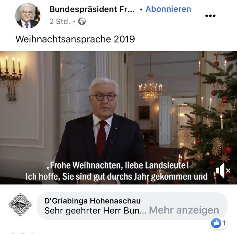 Der drittälteste Trachtenverein von Bayern, “D`Griabinga” von Hohenaschau im Chiemgau, gehen mit der Zeit und haben nun eine eigen Facebook-Seite. Die Hohenaschauer Trachtler freut es daher sehr, und es ist eine Ehre zugleich, dass sogar Bundespräsident Frank-Walter Steinmeier sich auch über die neue Facebook-Seite der D’Griabinga Hohenaschau freut, und den Kommentar mit „Gefällt mir 👍“ markiert hat.