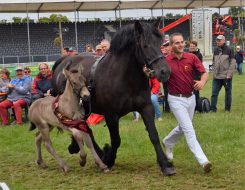 Nicht nur das jüngste, am 28. Mai in Gransee auf dem Zuchthof von Olaf Peter geborene, noch mausgraue Hengstfohlen (Anwalt von Tuchheim/Anna von Gransee/Arsenal) sorgte beim 14. Offenen Brücker Kaltblutfohlen Championat mit 34,5 Punkten (8.5-8.5-9-8.5) für Brandenburger Furore. Mecklenburgs Erfolgszüchter Günter Lüdders aus Malchow, der in Brück schon viele Sieger stellte, hatte ein kleines bisschen das Nachsehen. Sein Lakai (Louis/Nebenelbe III/Nerlinger) wurde ebenfalls wie der Petersche Rapphengst mit 34,5 Punkten (9-8.5-9-8) bewertet. Doch bei dem sehr jungen Granseeer Fohlen gaben ein gewisser Babybonus und etwas bessere Bewegungen den Ausschlag. Ein weiterer Lüdders Hengst, Elbstrand (Elan von Dönitz/Nordelbe/Nerlinger), kam mit 34 Punkten (8.5-8.5-9-8) auf Platz drei. Einen fünften Rang heimste Landmesser II (Louis/Norelli/Norfolk) mit 33 Punkten (8.5/8.5/8.5/7.5) ein. Der Altschweriner Schäfer Christian Platzeck, der im letzten Jahr noch das Sieger Hengstfohlen Luther stellte, erreichte beim diesjährigen Championat keine Platzierungen. Auch bei den Stuten rangierte ganz vorn eine gewichtige, großrahmige junge Madame aus Brandenburg, eine Tochter von Calvados von Brück, die Elina (Brabanter Hengst Nestor van Gaasbeck) am 9. April zur Welt brachte. Insgesamt 32 Punkte (8-7.5-6.5-7.5) gaben die Richter der in der Brücker Agrar- und Landschafts GbR am 9. April geborenen. Dieter Quaas, Rassevertreter im Verband der Pferdezüchter Mecklenburg-Vorpommern, Erdmann Schulz, Rassevertreter Kaltblut im Pferdezuchtverband Brandenburg-Anhalt und der Bayer Wolfgang Kühlechner von der Arbeitsgemeinschaft der Süddeutschen Pferdezuchtverbände bewerteten Typ, Exterieur, Bewegung und Schritt der 33 Probanden aus sechs Bundesländern. Darunter 12 Kaltblut Hengst -, 13 Stutfohlen, zwei Noriker und zwei Schwarzwälder, dabei wohl wissend, dass zu Urgroßvaterszeiten fast nur der Schritt im Vordergrund stand. Das heutige moderne, sportlichere Zuchtziel verlange andere Kriterien, hieß es. Dieter Quaas begründete vor erneut reichlich Zuschauern, dass das Siegerstutfohlen ein toller Rassetyp sei mit hervorragenden Trabbewegungen und herausragender Aufrichtung sowie großem Raumgriff. Im Schritt brillierte das blonde Rheinisch-Deutsche Kaltblutfräulein taktrein und raumgreifend. Thomas und Burkhard Haseloff zeigten somit als Chefs der Brücker Agrar- und Landschafts GbR und Titanen Veranstalter auch mit weiteren guten Platzierungen ihr züchterisches Können. Beim siegreichen Hengstfohlen von Olaf Peter betonte Dieter Quaas nicht nur die herausragende Qualität, sondern wies darauf hin, dass allein die sieben vorn platzierten Hengstlein höher bewertet worden seien als die beiden besten Stutfohlen mit jeweils 32 Punkten. Das zweite Stutfohlen (8-7.5-8.5-8) stellte die Sächsin Sylvia Keil aus Hartenstein/Zwickau vor. Es seien die besten Junghengste auf den Ringen zu sehen gewesen, die es jemals gab, betonte Ingo Nörenberg. Sonst hätten stets die Stuten die Nase vorn gehabt, äußerte der wieder eloquent moderierende, gut gelaunte Verbandszuchtleiter. Das habe allerdings einen winzigen Wermutstropfen, da züchterisch mehr Stuten als Hengste zum Einsatz kämen. Das Brücker Championat sei mit seiner Einbindung in die 17.Titanen der Rennbahn mit gut 370 Kaltblütern in diesem Jahr gleichzeitig eine gute Orientierungs- und Kaufplattform. „Man muss den Hut ziehen, wie es dem Brücker Kaltblut Zucht- und Sportverein gelingt, so einen Großveranstaltung jedes Jahr erfolgreich zu organisieren, ohne dabei die Bodenhaftung zu verlieren“, lobte Ingo Nörenberg das Team um Thomas und Burkhard Haseloff. Das unterstrich auch Richter Wolfgang Kühlechner aus dem mittelfränkischen Gunzenhausen. Als er im letzten Jahr nicht in Brück sein konnte, „habe ihm etwas gefehlt. Brück mit den Titanen ist eine ganz besondere und wunderbar andere, eine harmonische Pferde Welt.“