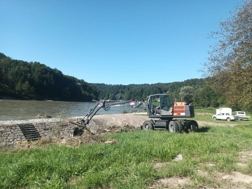 Heftiger Regen innerhalb kürzester Zeit hatte den Pegel der Salzach am 29. August schnell steigen lassen. Das Wasser überströmte die Ufer und ließ, neben einigen Kubikmetern Sand, Unmengen an Treibholz liegen. Dieses muss nun zunächst sortiert werden: Dazu hat das Wasserwirtschaftsamt eine Firma beauftragt, die mit einem mobilen Bagger auf Rädern die Strecke abfahren wird. Kilometer für Kilometer wird der Bagger das angeschwemmte Holz nach Größe sortieren, ehe es ein Lkw zu neu eingerichteten Zwischenlagerplätzen am Ufer bringt. Von dort wird es zur Verwertung gefahren. Baumstämme und andere große Stücke werden fachgerecht zerkleinert und zu Hackschnitzeln verarbeitet. Das kleinere Holz wird verbrannt oder kompostiert. Den Sand wiederum schieben die Arbeiter zurück in die Salzach. Gegen Ende Oktober wird die Verbindung zwischen dem Ortsteil Unterhadermark und der Stadt Burghausen wieder ohne Einschränkung nutzbar sein