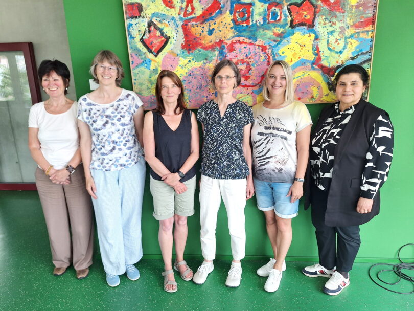 Bericht und Foto: Stadt Burghausen / Haus der Familie –  Die ehrenamtlichen Deutschlehrkräfte Barbara Reineke und Ute Paetsch vom Mütterkurs des Asylhelferkreises (von links), Simone Zemke und (ganz rechts) Amal Moussa vom Alphabetisierungskurs und die Deutschlehrkräfte der Stadt Burghausen Karola Wenski und Natalia Laib. Nicht im Bild Bettina Weiß-Schubert.