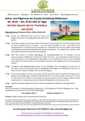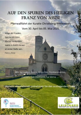 Der Pfarrverband Westliches Chiemsee mit der Kuratie “Christkönig” von Wildenwart unternimmt eine Bus-Wallfahrtsreise nach Assisi. Die Fahrt geht mit dem Wallfahrts-Spezialisten Leidinger Innviertler Busreisen vom 30. April bis 5. Mai.