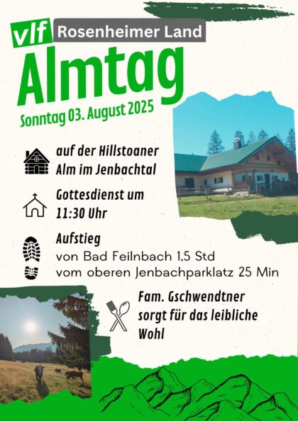Zusätzlich findet am Sonntag, 3. August der Almtag auf der Hillstoaner Alm im Jenbachtal statt, organisiert vom vlf Rosenheimer Land.