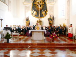 „Musik im Gottesdienst ist ein Hinführen in unsere Beziehung zu Gott“, sagte der Zelebrant Pfarrer Peter Bergmaier. Er dankte der Musikkapelle für ihre oftmalige musikalische Umrahmung von kirchlichen Anlässen. Ein herzliches Vergelts Gott richtete er auch an die Trachtler für ihre Pflege der Gemeinschaft und dafür, dass sie mit ihren Tänzen Freude am Leben ausstrahlen würden. Im Hinblick auf das an diesem Tag ebenfalls begangene Christkönigsfest fügte er hinzu, dieser gemeinsam gefeierte Gottesdienst zeige, „dass wir alle mit Gott verbunden sind mit Jesus als unserem König vorne dran“.