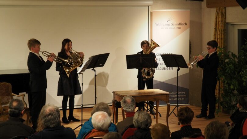 Passend umrahmt wurde die Veranstaltung von vier jungen Bläsern der Grassauer Musikschule unter der Leitung von Wolfgang Diem. „Easy Brass“ spielte u.a. „Dreher & der Schimmi“ von Carl Orff.