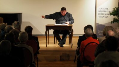 Gesprochene Musik von Carl Orff – Dort, wo sonst eher klassische Instrumente erklingen, entführte Klaus Wittmann nur mit seiner einzigartigen sonoren Stimme und seinen Händen in einer authentisch altbairischen Mundart und als profunder Kenner die Zuhörer in die Welt von Carl Orffs Werk „Bairisches Welttheater“.