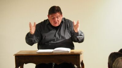 Im ersten Teil trug Klaus Wittmann die unterschiedlichsten Charaktere der Bairischen Gauklerkomödie „Astutuli“ mit verschiedenen Stimmlagen so vor, als ob ein komplettes Theaterensemble samt Chor und Orchester auf der Bühne stand, obwohl er ganz alleine an einem Tisch saß. Dieses zeitlose Stück zeigte dem Publikum die Welt der Superschlauen auf, welche sich gegenseitig über den Tisch ziehen, ohne es rechtzeitig zu merken. Im zweiten Teil folgte mit der „Bernauerin“, die bekannte Liebestragödie aus dem 15. Jahrhundert des bayerischen Herzogsohns Albrecht und der Augsburger Baderstochter Agnes Bernauer. Auch hier hörte man die galoppierenden Pferde (mittels Trommeln auf dem Tisch) ganz deutlich genauso wie das Plätschern der Donau bei Straubing, in der Agnes im Auftrag von Herzog Ernst als Hexe ertränkt wird. Und schließlich verstummten die immer wiederholenden lauten Schreie Albrechts nach Agnes, Agnes, Agnes…, als der Tod seines Vaters verkündet wird. Die einzelnen Szenen – so grandios vorgetragen – erschienen wie ein Film vor den Augen der Zuhörer. Auch wenn man sich in die Sprache der Stücke vielleicht erst ein wenig hineinhören musste, wurde von Wittmann eine Klangwelt wie gesprochene Musik auf die Bühne gezaubert.