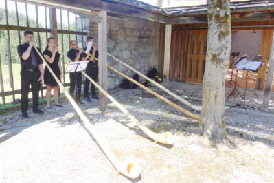 Bericht und Bilder: Sepp Hauser – Die Chiemgau Horn Connection gefiel mit schönen Weisen bei der Bergkirchen-Andacht auf der Winklmoos-Alm.