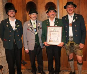 Für seine Verdienste um die Trachtensache und den Chiemgau-Alpenverband wurde Anton Hötzelsperger (zweiter von rechts) bei der Frühjahrstagung des Chiemgau-Alpenverbands in der Festhalle in Hohenaschau zum Ehrenmitglied des Verbandes ernannt. Der erste Vorsitzende Miche Huber (rechts) und seine beiden Stellvertreter Franz Fischer (links) und Georg Westner (zweiter von links) überreichten dem Geehrten die Urkunde als Anerkennung für seine außerordentlichen Verdienste um die Trachtensache.