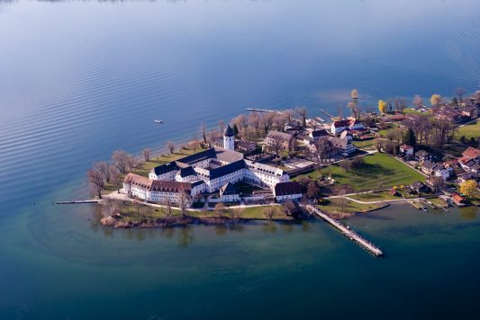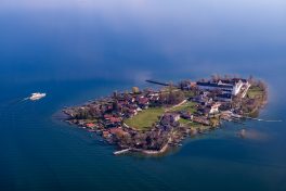 Im Wasser spiegeln sich noch die schneebedeckten Gipfel der Chiemgauer Berge und auf dem ganzen Chiemsee ist nur ein Schiff der Chiemsee-Schifffahrt unterwegs. Dazu kommen an Land noch die immer farbiger werdenden Wiesen, Äcker und Dörfer, so dass unverkennbar der Frühling und die Ausflugssaison begonnen haben. Von dieser reizvollen Chiemgauer Landschaft und frühlingshaften Aufbruchstimmung zeugen diese aktuellen, aus der Luft aufgenommenen Bilder mit dem Chiemsee, der Frauen- und Kraut-Insel sowie mit den dahinter liegenden Chiemgauer Bergen.