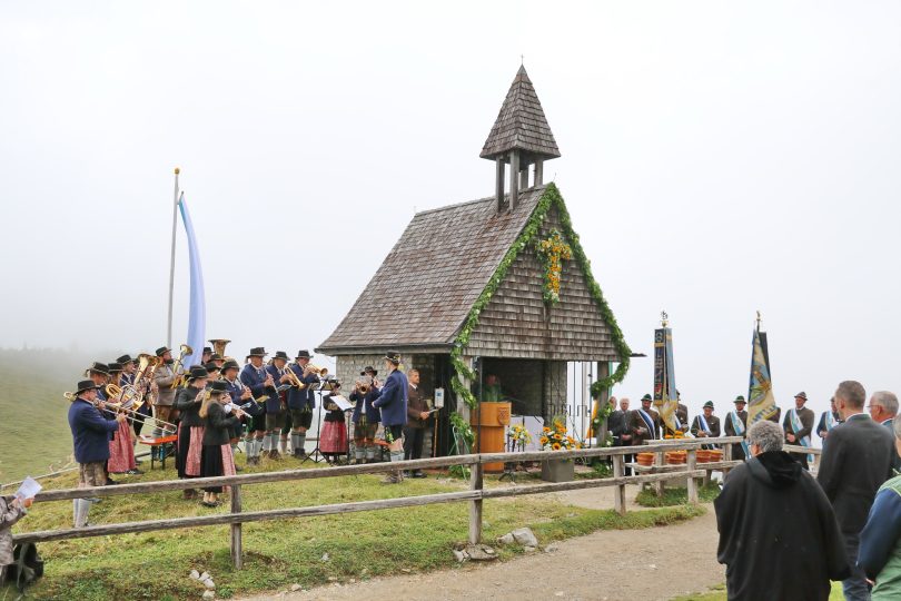 „So ähnlich wie ich euch heute an diesem Ort unter dem Gipfelkreuz der Kampenwand sehe, muss auch Jesus die vielen Männer, Frauen und Kinder gesehen haben, als er seine Bergpredigt hielt“, so Michael Mannhardt, Dekan des Dekanates Miesbach und Leiter der Pfarrverbände Hausham und Miesbach, der den Gedenkgottesdienst für die Gefallenen des Chiemgaus an der Kapelle „Maria Königin des Friedens“ auf der Kampenwand zelebrierte; Dekan Mannhardt ist gebürtiger Traunsteiner und seit Kindesbeinen mit diesem Kreuz vertraut. Das „Chiemgaukreuz“ ist mit zwölf Metern Höhe und 54 Zentnern Gewicht das größte eiserne Gipfelkreuz in den Bayerischen Alpen. Bronzene Gedenktafeln erinnern seit 1951 an die Gefallenen und Vermissten von 58 Gemeinden rund um den Chiemsee aus den beiden Landkreisen Rosenheim und Traunstein.