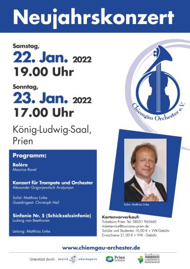 Da das Herbstkonzert des Chiemgau-Orchesters dem Lockdown zum Opfer fiel, haben sich Musiker und Vorstand kurzerhand dazu entschlossen, aus dem Herbstkonzert ein Neujahrskonzert zu machen. Da die Zuschauerzahlen stark eingeschränkt sind, wird das Konzert zweimal gespielt: