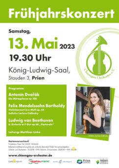 Das Chiemgau-Orchester wird am Samstag, 13. Mai um 19.30 Uhr sein diesjähriges Frühjahrskonzert im König-Ludwig-Saal in Prien präsentieren. Am vergangenen Wochenende fand die Hauptprobe im Probenraum der Blaskapelle Wildenwart statt. Gespielt wurden die Mittagshexe von Antonin Dvorak, die “Pastorale” von Ludwig van Beethoven und das Violinkonzert von Felix-Mendelssohn Bartholdy.