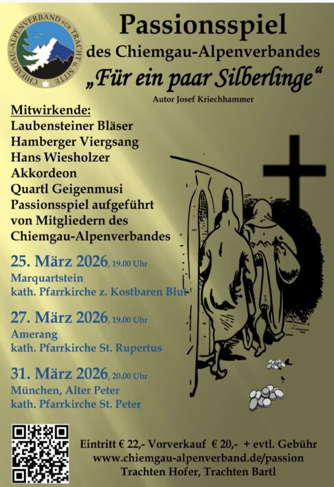 Der Chiemgau-Alpenverband bereitet sich auf das Passionsspiel zu seinem Jubiläumsjahr 2026 vor (100 Jahre Bestehen des Trachtenverbandes). Unter dem Titel „Für ein paar Silberlinge“ von Josef Kriechhammer wird das Werk von Mitgliedern des Gaus aufgeführt und musikalisch gestaltet.