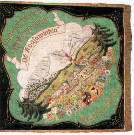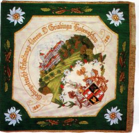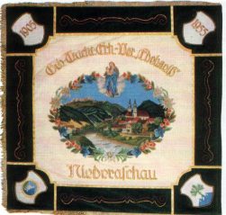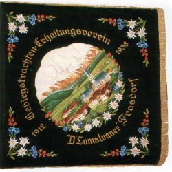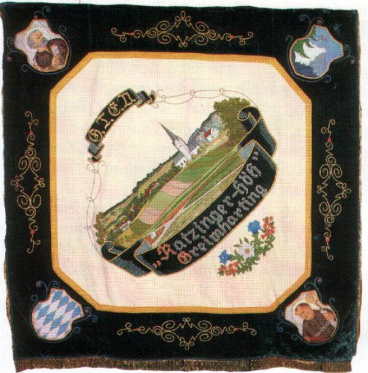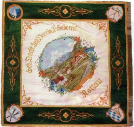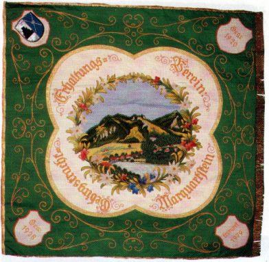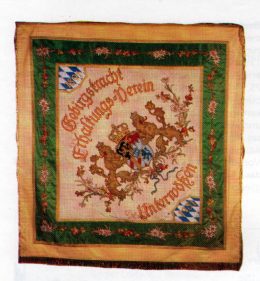 Und jetzt das! Ohne eigene Fahne war der Verein doch der Gar-Niemand im Dorf, alle hatten anderen sie eine, eine Fahne, ein Banner, einen Wimpel oder gingen hinter den verschiedenen Fahnen der kirchlichen Organisationen nach. So war der Wunsch nach der eigenen Fahne als Zeichen der Zusammengehörigkeit das erste, was sich der Verein gleich nach seinen ersten Anfängen erfüllen wollte. Doch Fahnen sind teuer, die Schwestern in den Klöstern verlangten viel Geld für die Stickereien, bedruckte Fahnen waren eine andere billigere Möglichkeit. So hieß es zunächst sparen und Geld sammeln, gar nicht so einfach, wenn die Masse der Mitglieder kein Geld hat, wenn hauptsächlich Dienstboten und nachgeborene Bauernsöhne zu den Platterabenden zusammenkommen. Ein paar Jahre dauerte es schon, dann war genug Geld beisammen und die Fahne konnte bestellt werden.