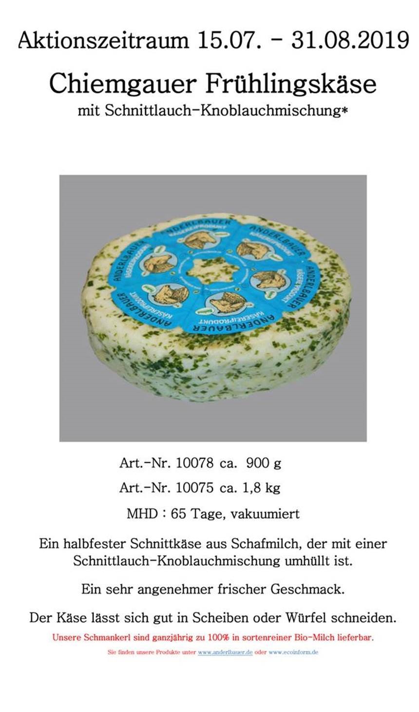 Ab heute, 15. Juli, bis einschließlich 31. August 2019 bietet der Frasdorfer Käsehersteller Anderlbauer als besondere Aktion einen Chiemgauer Frühlingskäse mit Schnittlauch-Knoblauchmischung an.