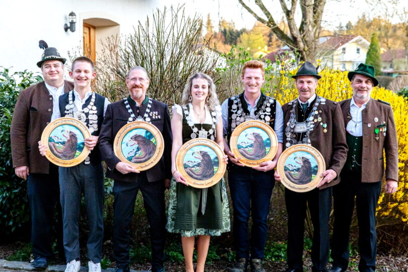 Foto: v.l.: 2. Gauschützenmeister Uwe Kueres, Jugendkönig Emil Webersberger, Auflagekönig Karlheinz Scheibeck, Damenkönigin Simone Langl, Luftgewehrkönig Martin Bauer, Luftpistolenkönig Franz Englbrechtinger, 1. Gauschützenmeister Bernhard Brehmer