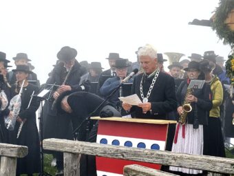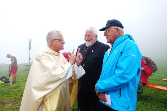 „Wollen wir das mit dem Gedenken auf der Kampenwand nicht einmal sein und ruhen lassen? Am besten man lässt Gras darüber wachsen!“ – in diesem Sinne wurde Erster Bürgermeister Thomas Schmidinger von der Gemeinde Schnaitsee angesprochen als es darum ging, die heurige und inzwischen 73. Gedenkfeier für die Opfer der beiden Weltkriege bei der Kapelle „Maria, Königin des Friedens“ auf der Kampenwand vorzubereiten. Die Gemeinde Schnaitsee war heuer mit der Ausrichtung beauftragt, traditionell wechseln sich Gemeinden aus den Landkreisen Rosenheim und Traunstein mit dieser Aufgabe zusammen mit der stets mithelfenden Gemeinde Aschau i. Chiemgau ab. Auch der Kampenwandbahn galt ein Dank für deren großzügige Unterstützung.